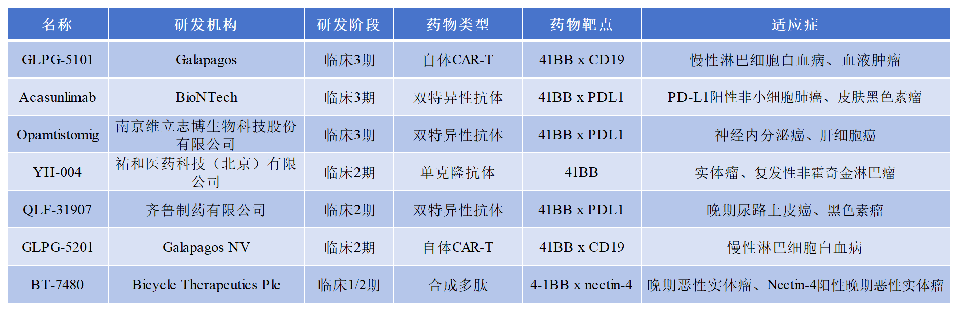 关于4-1BB,第一代药物研发主要聚焦于4-1BB的激动型抗体类药物:2005年百时美施贵宝(BMS)公司首次开发的抗体药物urelumab (BMS-663513),但后续由于肝毒性的不良事件而终止开发;第二款4-1BB的抗体药物是由辉瑞开发的utomilumab (PF-05082566),于2011年进入临床试验,但是它的疗效很有限,最终也停止在临床开发。第二代4-1BB激动型药物主要分为两大类:IgG类型(单抗结构)以及双/多抗的4-1BB激动型药物。