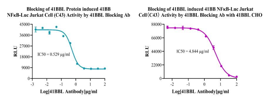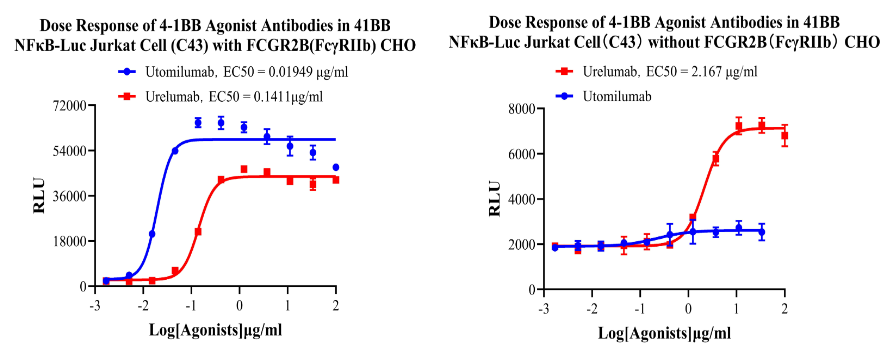 为助力4-1BB靶点药物研发,我们开发了41BB/CHO、41BB/HEK293、41BB/NFκB-Luc/HEK293、41BB/NFκB-Luc/Jurkat和4-1BBL CHO细胞筛选模型,产品验证结果如下: