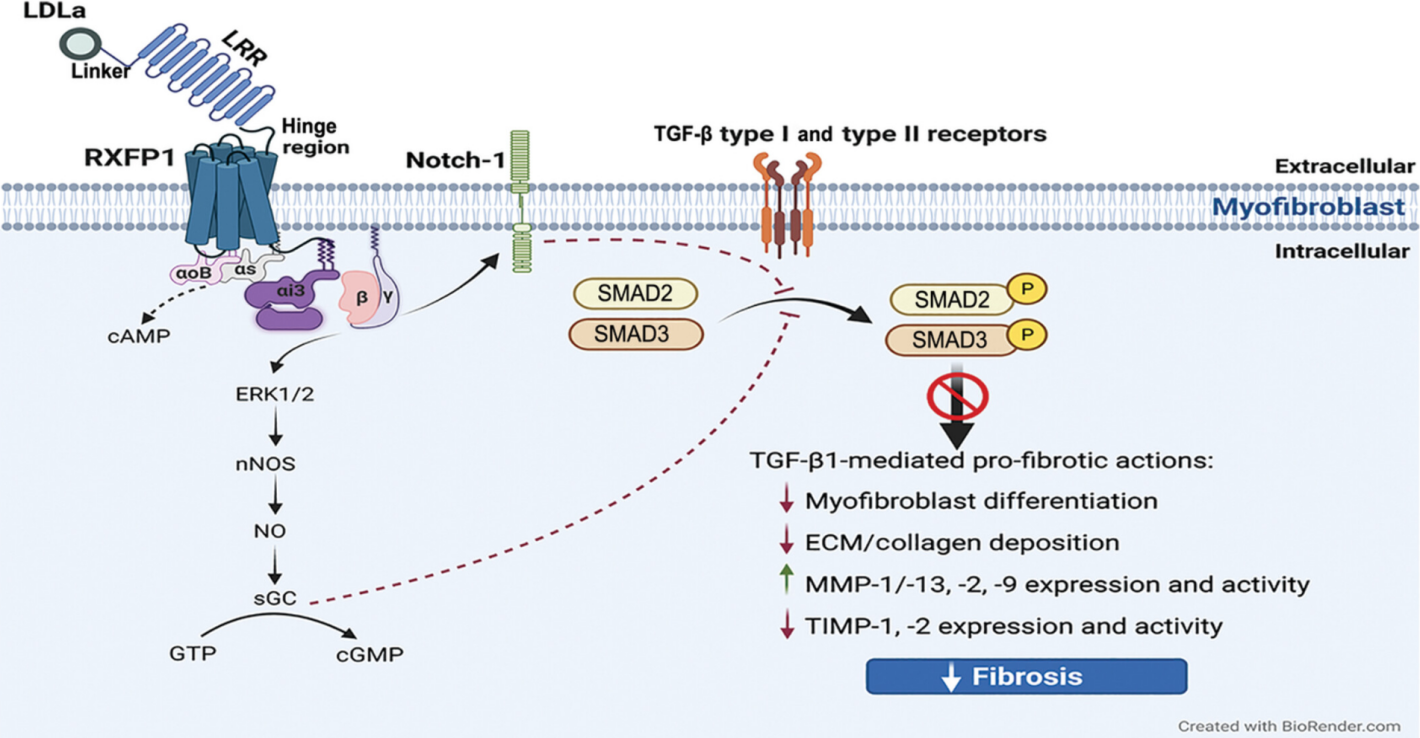 RXFP1 是一种 C 型 LGR 相关 GPCR,含有由多个细胞外基序组成的约 400 个氨基酸的大细胞外区域,包括富含亮氨酸的重复结构域(LRR)和低密度脂蛋白 A 类 (LDLa) 模块,它们通过连接子区域连接。RXFP1在其 LRR 相关胞外结构域内激活,引发受体的构象变化,然后允许其 7TM 结构域的细胞外环内低亲和力结合位点的相互作用和激活,这由其连接子区域促进。受体的连接子区域在配体结合时稳定受体构象方面起着关键作用,并将残基定位在连接子区域和 LDLa 模块内以与 7TM 结构域结合并激活受体。然后,该作用使 LDLa 模块能够充当系留激动剂,并在配体结合时引导受体信号传导。位于 RXFP1 C 末端的铰链区域在受体激活时也会发生构象和增加暴露,以诱导 G 蛋白 (Gαs, GαOB, Gαi3和 Gβγ) 活动。在肌成纤维细胞中,这导致 cAMP 短暂升高,但 pERK1/2 增加更持久,nNOS-NO-sGC-cGMP 活性因 RXFP1-ERK1/2 依赖性增加。RXFP1-pERK1/2-nNOS-NO-sGC-cGMP 依赖性途径的激活或肌成纤维细胞直接激活 cGMP 然后抑制 SMAD2 和 SMAD3 水平的 TGF-β1 信号转导,从而抑制 TGF-β1 促进肌成纤维细胞分化和肌成纤维细胞诱导的 ECM/胶原蛋白合成和沉积的能力。RXFP1 激活还可以调节 Notch-1 依赖性信号传导,以抑制肌成纤维细胞中的 TGF-β1/SMAD3 轴。此外,RXFP1-pERK1/2-nNOS-NO-sGC-cGMP依赖性途径的激活导致ECM降解MMP的表达和活性增加(当TGF-β1活性上调时通常受到抑制),以及TIMP的活性降低,这将促进MMP诱导的已建立ECM/胶原沉积的分解,并有助于减少纤维化进展。