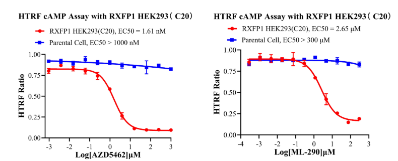 为助力RXFP1靶点药物研发,南京科佰开发了RXFP1 CHO、RXFP1 HEK293细胞筛选模型,产品验证结果如下: