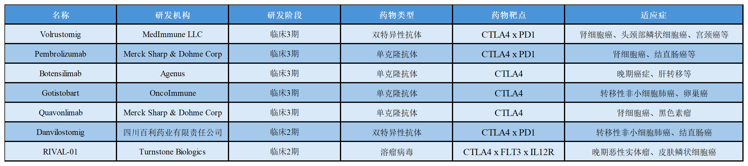 此外,CTLA4也可以与其他免疫检查点联合用药,如PD1、IL2、OX40等,联合靶点药物的研发也取得一定进展,由齐鲁制药研发的CTLA4 & PD1双特异性抗体Iparomlimab和由中山康方生物医药有限公司研发的CTLA4 & PD1双特异性抗体Cadonilimab已批准上市。