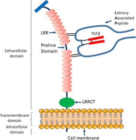 GARP 基因位于人类染色体 9q34.3,GARP蛋白(也称为 LRRC32)是一种约78 kDa的 I 型跨膜蛋白,由 662 个氨基酸组成,属于亮氨酸富集重复序列(LRR)家族。GARP蛋白根据其一级序列在结构上分为三个结构域:细胞外结构域、跨膜结构域和细胞内结构域。细胞外结构域包含两组 10 个 LRR,由一个富含脯氨酸的结构域和一个 C 端 LRR (LRRCT) 分隔。两个保守的Cys残基(Cys-192和Cys-331)分别位于第7和第12个LRR,负责潜在TGF-β的GARP和LAP的Cys-4之间形成两个二硫键。