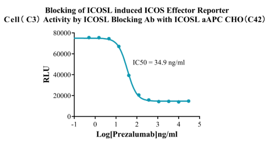 Figure 4. Blocking of ICOSL induced ICOS Effector Reporter Cell(C3) Activity by ICOSL Blocking Ab with ICOSL aAPC CHO(C42).