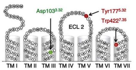 CHRM1-5 均为单亚基 7 次跨膜(7TM)糖蛋白,属于 GPCR A 类(视紫红质样)家族,其核心结构高度保守,决定了配体结合与信号转导的基础框架:跨膜结构域(TM1-TM7):由 7 个疏水 α 螺旋组成,是受体的核心骨架,其中 TM3-TM7 形成的疏水口袋是乙酰胆碱等配体的结合位点。胞外环(ECL1-ECL3)参与配体的识别与结合,对配体的特异性起辅助作用。胞内环(ICL1-ICL3)是与 G 蛋白结合的关键区域,其中ICL3 的氨基酸序列差异最大,直接决定了各亚型与不同 G 蛋白的偶联特异性。