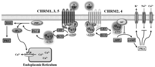 尽管CHRM1-5在结构上具有高度同源,但按 G 蛋白偶联类型可分为两类:Gq/11 偶联型(M1、M3、M5) 和Gi/o 偶联型(M2、M4),这种差异直接决定了其生理功能与疾病关联的特异性。