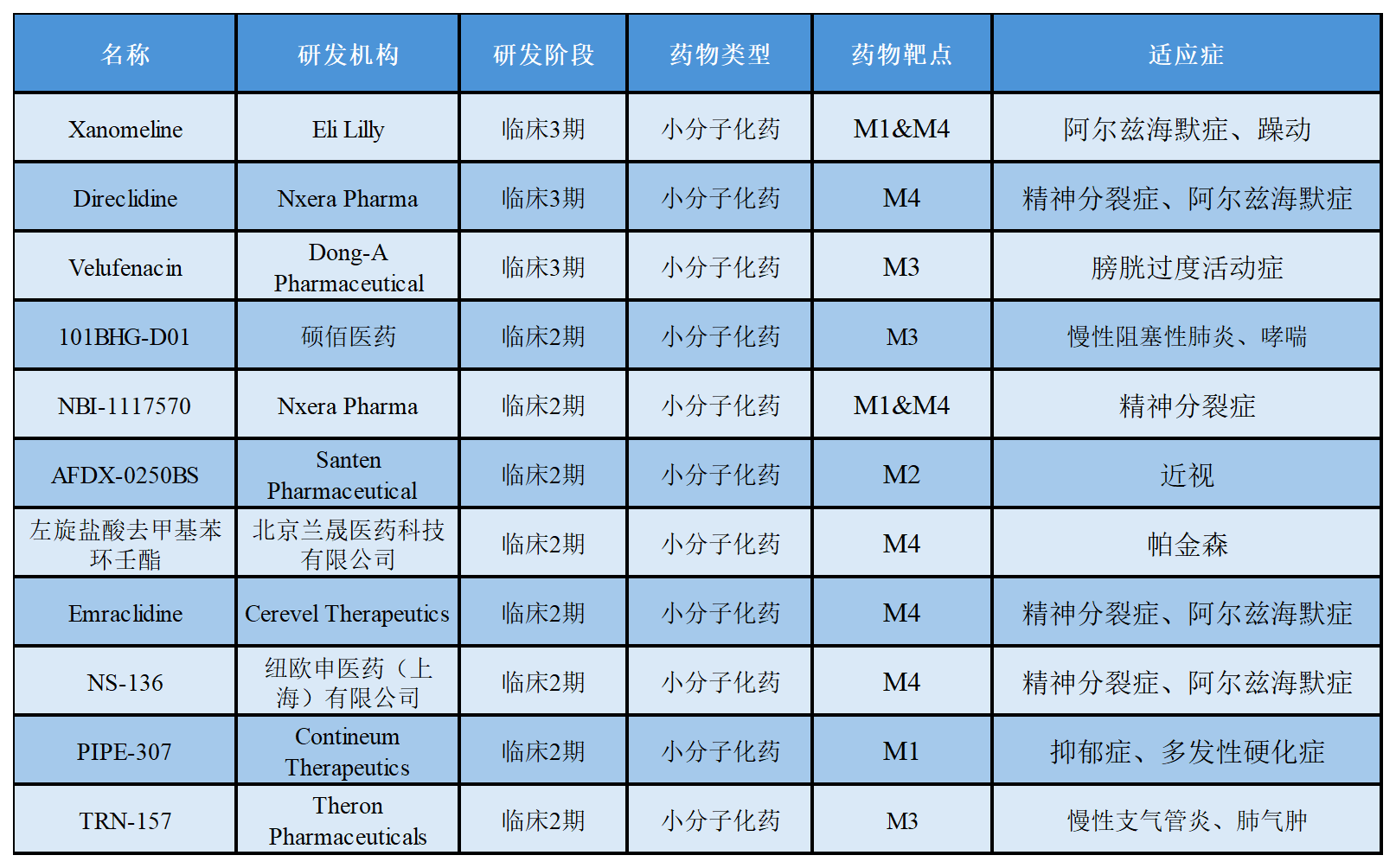 关于CHRM 1-5在研的部分药物进展如下表所示: